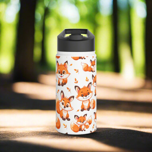 Insulated Water Bottle, 12oz, Cute Baby Foxes - Double Walled Stainless Steel Thermos, Keeps Drinks Hot or Cold