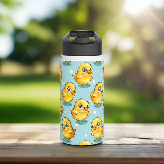 Insulated Water Bottle, 12oz, Cute Baby Chicks - Double Walled Stainless Steel Thermos, Keeps Drinks Hot or Cold