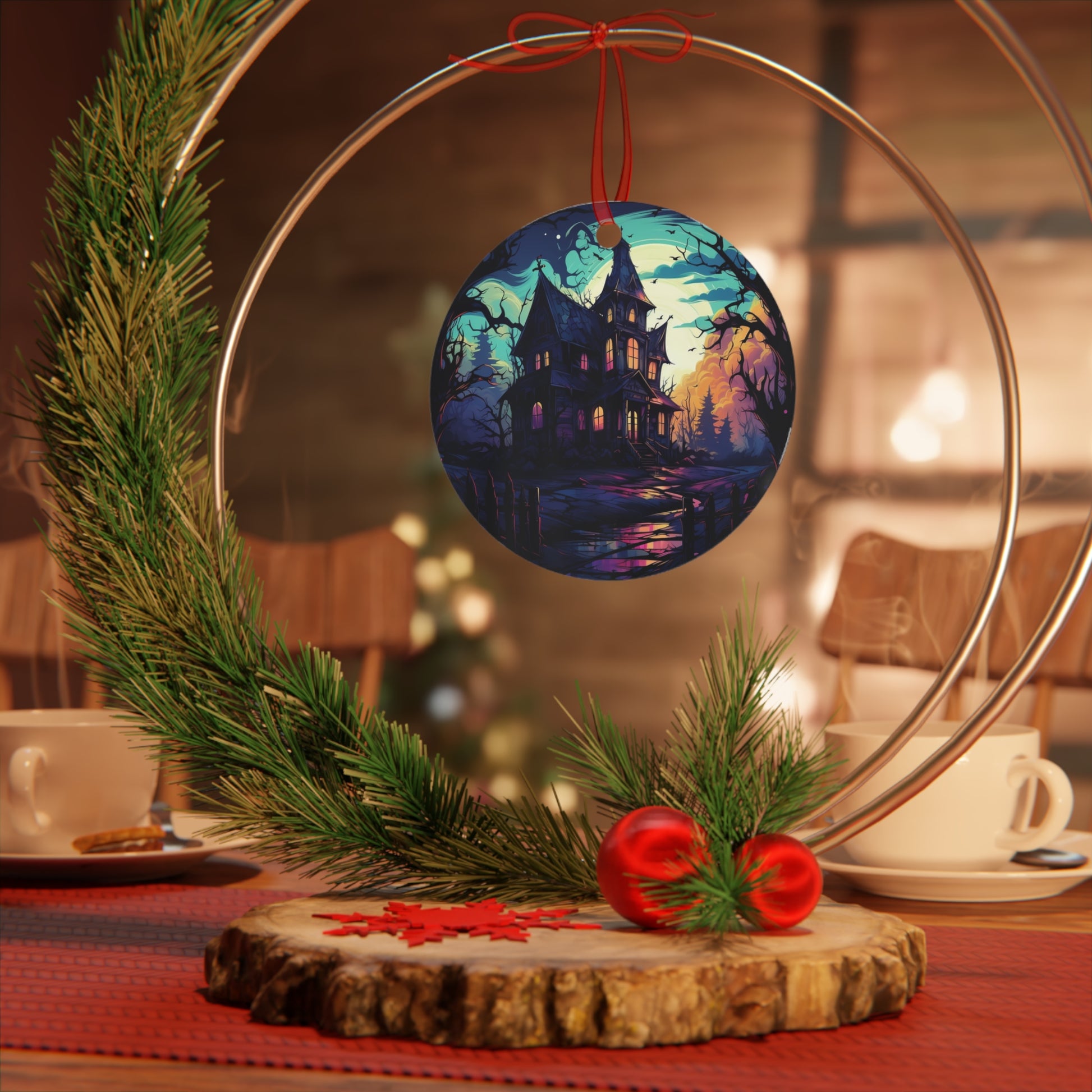 Step into a realm where goth meets spine-tingling suspense with our "Haunted House Halloween Ornament". Meticulously crafted on a robust white aluminum base, this round metal ornament captures the eerie magnificence of a haunted mansion, with its towering spires and shadowy windows evoking tales of mysteries untold. Rendered in stunning high resolution, every architectural detail of the spooky mansion stands out, further accentuated by a glossy finish that adds an almost ethereal glow.