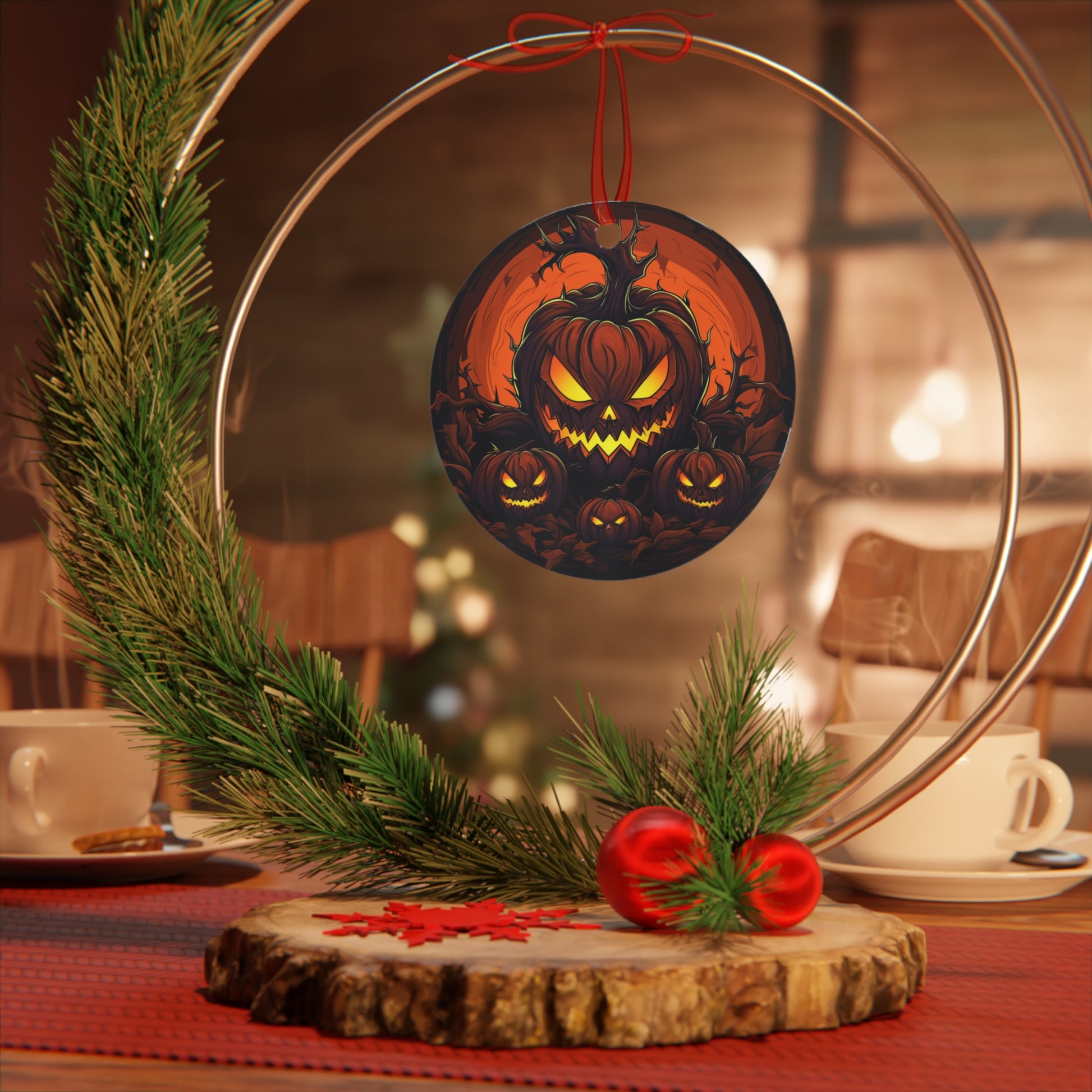 Dive into the spooky spirit of Halloween with our "Scary Pumpkin Jack-O-Lantern Halloween Ornament". Crafted with meticulous detail, this round metal ornament paints the very essence of horror and mini heart-stopping moments that Halloween is famed for. Set on a sturdy white aluminum base, the creepy design is printed in vibrant high resolution, ensuring the eerie glow of the Jack-O-Lantern stands out in all its spine-chilling glory.