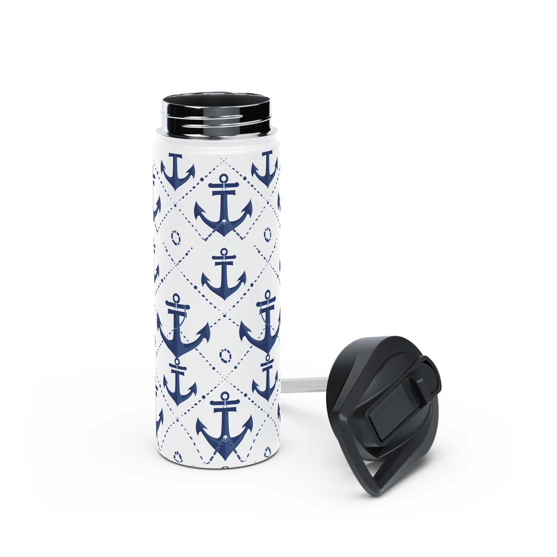 Quench your thirst in style with our sleek, nautical Navy Anchors Stainless Steel Water Bottle! This 18 oz marvel isn't just about looks – it's packed with features that make it your new favorite hydration companion, perfect for a day at the lake, on the ocean, or as a gift for a beach and ocean lover.