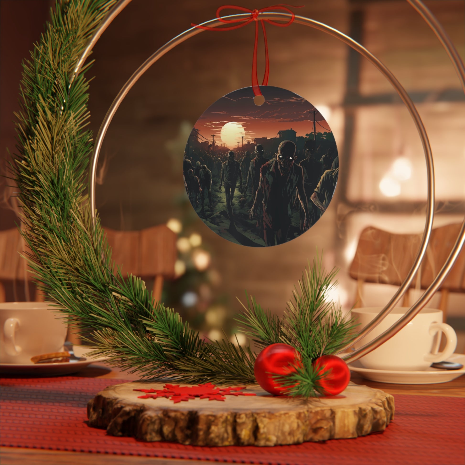 Delve deep into the eerie realms of Halloween with our "Undead Zombie Horde Halloween Ornament". Expertly shaped on a sturdy white aluminum base, this round metal ornament unveils a mini apocalypse, showcasing a chilling horde of the walking dead. Captured in crisp high resolution and accentuated by a gleaming glossy finish, every undead visage and twisted form echoes the nightmarish tales of horror that chill us to the bone.